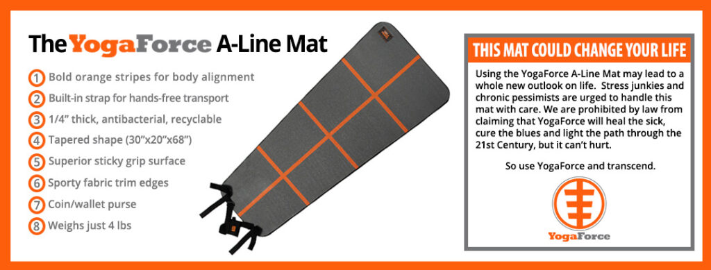 Roy Wallack of The Los Angeles Times gave this Patented A-Line Mat from YogaForce® an A! “No more finding yourself cockeyed on the mat during downward-facing dog. Inventor Annie Appleby, knocked crooked in a car accident, added a center line and three horizontal lines to align herself, and it kept me straight every time. The ergonomic shape fits your body great and, for many poses, it helps keep your face out of where your feet just were. The carry straps, conveniently sewed onto the rear, never get misplaced and include a built-in key or money holder.”